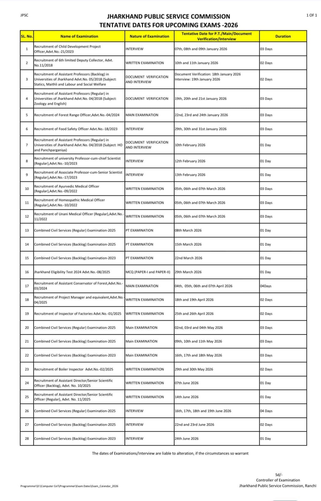 | 20 | Combined Civil Services (Regular) Examination-2025 | MAIN EXAMINATION | 02nd, 03rd and 04th May 2026 | 03 Days |