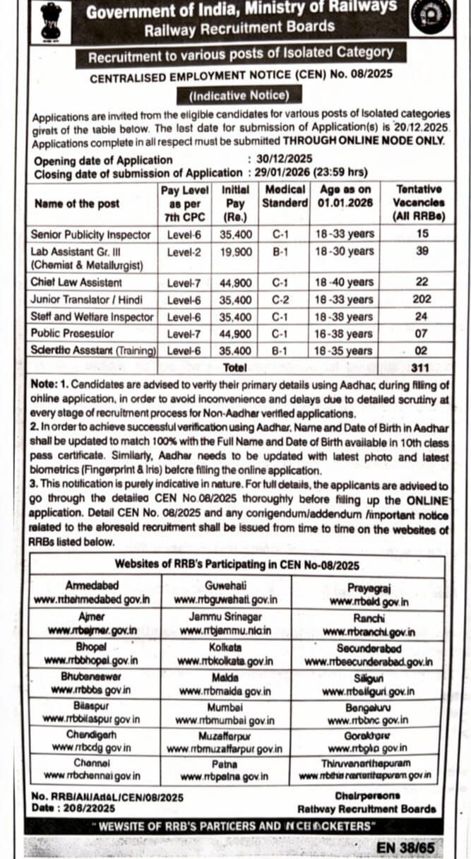 RRB Isolated Category Recruitment 2025 : vacancy details